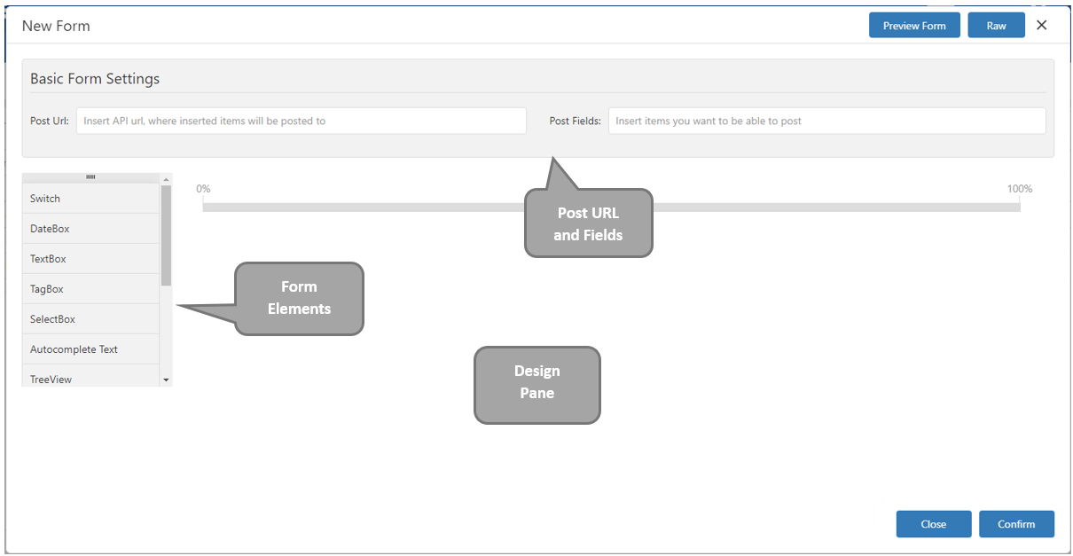We will create a new form. Click on + Add new form button at the top of a table. A form designer popup will open up.