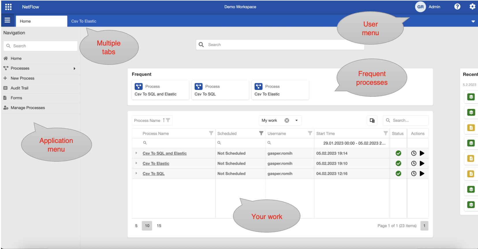 Frequent & My Work: Here you can find your most frequently executed processes and a table indicating the work you have done inside application.