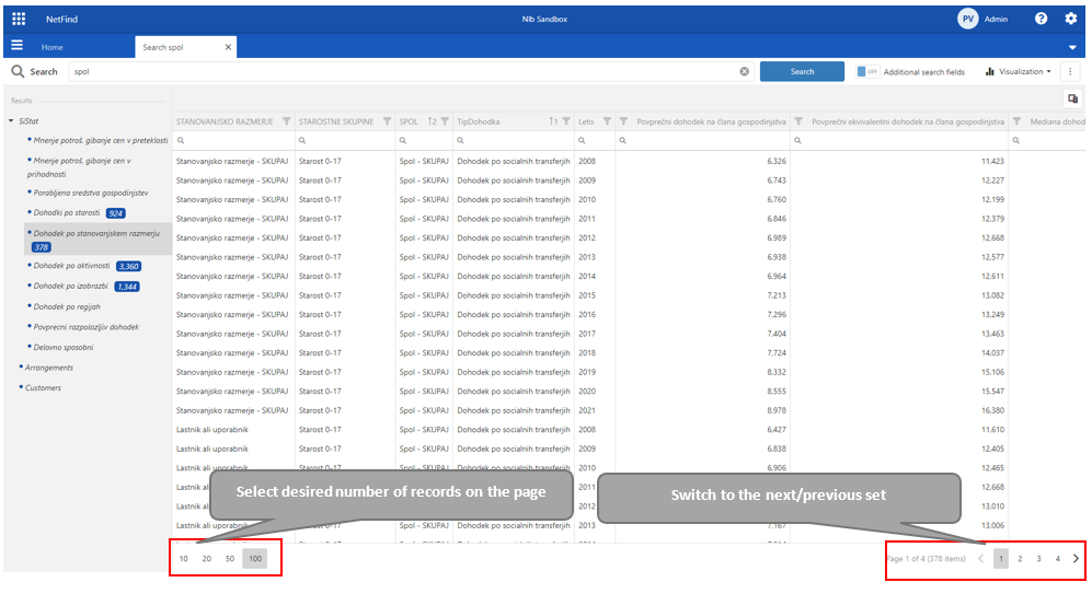 Number of rows in set, next set of records and data export