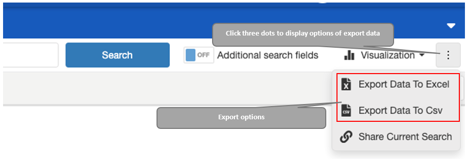 Users can export data to MS Excel or CSV format. The export function is placed next to the »Visualization« button.