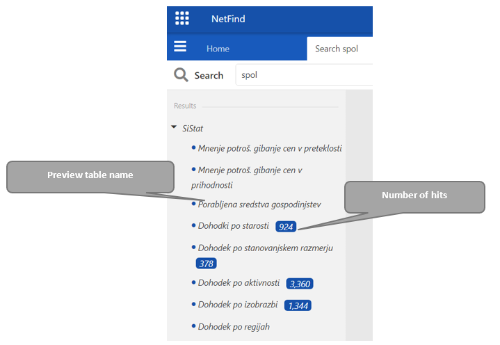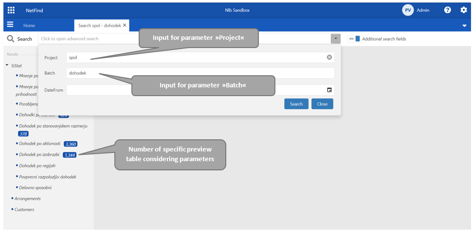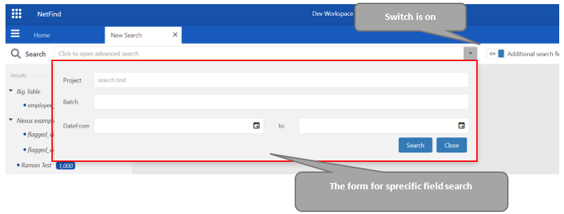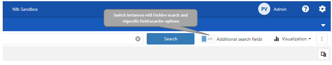 An application enables search by specific fields in the result data also. Switching the on/off »Additional search fields« button allows a user to choose between »all fields search« and »specific fields search«.
