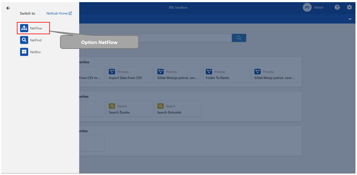 Opens navigation menu with NetFlow, NetFind and NetBox options. Choose the NetFlow option to switch to the NetFlow application.