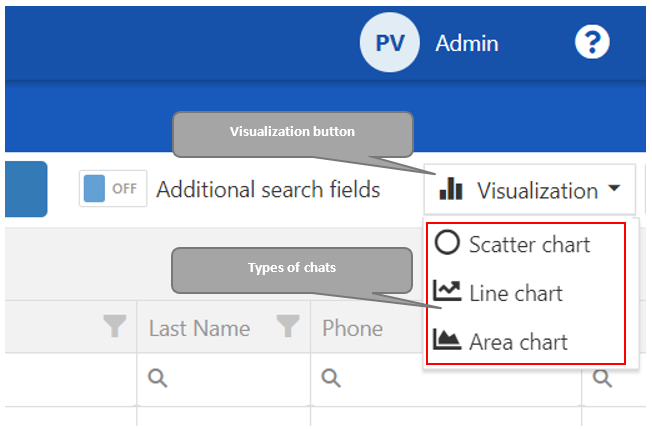 The Application provides simple data visualization. When data are filtered, a user can visualize data in a preview table. Button »Visualization« is next to the »Additional search fields« switch.